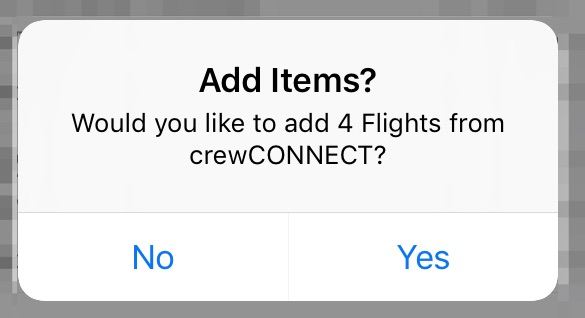 LogTen Pro X will automatically open up and show a prompt to confirm you will be importing flights from CrewConnect. Click on “Yes” to add the flights.