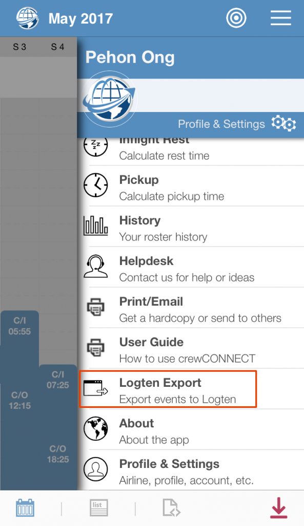 After downloading your roster into CrewConnect, export your flights into LogTen Pro X by selecting “LogTen Export”