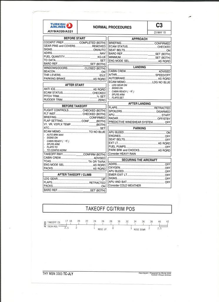 The checklist is the paper checklist from Turkish Airways, and is a reasonably generic checklist that most airlines flying the A320 follows. For the purpose of the simulator check, MEMORISE the responses from the following phases.